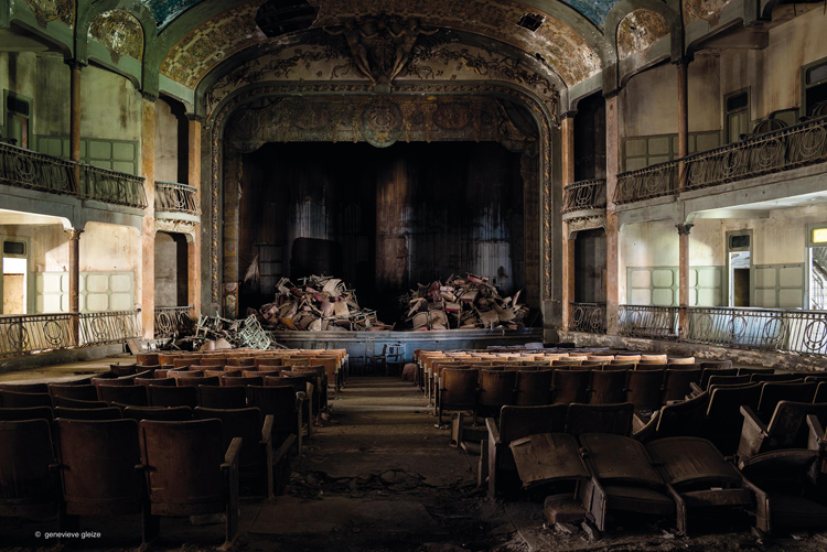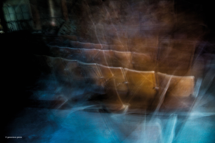 D’après Paul Valéry, qu’il faut toujours citer quand on veut paraître sérieux, « la mort nous parle d’une voix profonde pour ne rien dire », et vraiment ces photos ne disent rien qu’elles ne voient ou croient voir… Mais ces fauteuils qui nous tendent leurs bras, ces irisations indéfinies, ce promenoir vide où l’on imagine un peuple fellinien, ces lambeaux de toiles peintes, cet escalier dérobé montant vers quel ciel ?, ce balcon de masques dignes d’un Macbeth infernal, ce couple enfin, découpé sur fond de néant, qui semble les Parques filant nos destins, tordues dans le tourment de leur propre obligation, ne sont-ils pas l’expression de la tragédie du fugitif, de l’insaisissable, de l’irréalité à travers la réalité elle-même ? Une autre phrase d’un autre grand poète me revient comme à chaque fois que je m’émeus d’un surgissement d’émotion, elle est de Chateaubriand : « Rompre avec les choses de ce monde, ce n’est rien, mais avec les souvenirs… Le cœur se brise à cet adieu tant il est peu de choses réelles dans l’homme ». Geneviève Gleize nous offre ce trouble. Grâce à elle, nous accédons à une réalité augmentée.