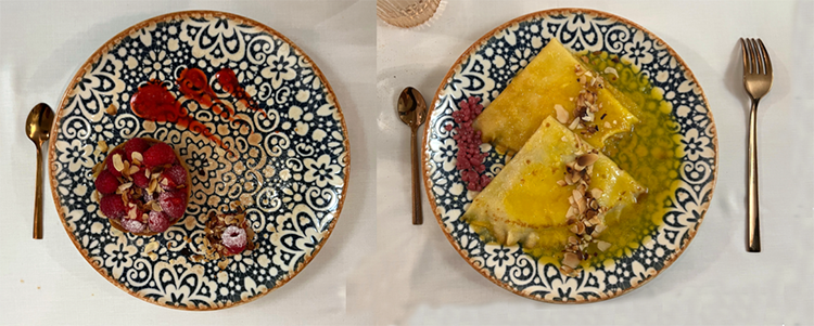 Un menu à 280 DH avec entrées, plats, desserts est proposé. Spécialités marocaines, mini pastilla de poulet, truite fumée de l’Atlas, tagine de poulet aux amandes, filet de Saint Pierre sauce vierge et de délicieux desserts: crêpes fondantes à l’orange, amandes et miel et la fameuse tarte aux framboises d’Abdellah avec une pâte sablée totalement divine.