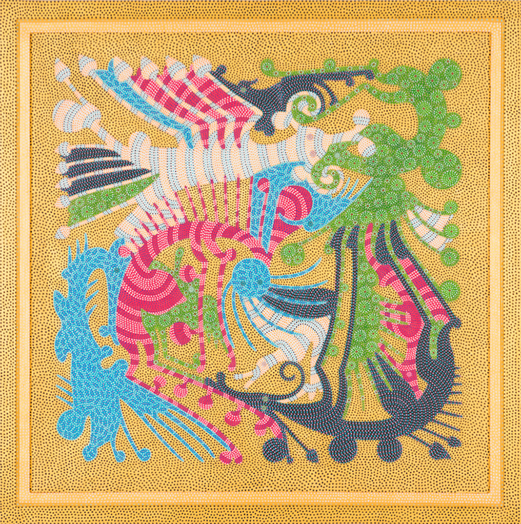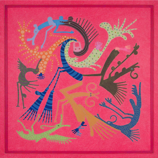 Ses peintures sont parfois tendres par leurs tons pastels et la douceur des courbes du dessin ; parfois, formes lisses et couleurs vivantes rappellent la rudesse de la vie dans cette région aride peuplée de chimères inquiétantes. Certains tableaux font d’ailleurs penser aux gravures rupestres, comme celles des aborigènes d’Australie, qui peuvent être rapprochées des créations contemporaines comme les «nanas» de Niki de Saint Phalle. L’artiste a aussi choisi de peindre des racines dont les formes complexes quident son imagination vers ces grouillements de reptiles et de serpents qui lui sont familiers…