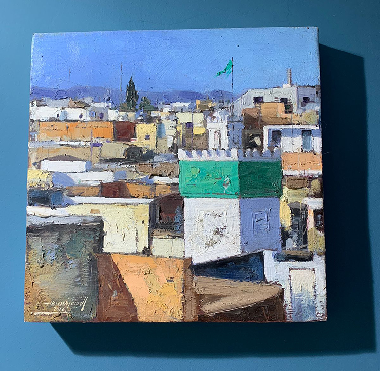 On peut également découvrir le travail de Abdeuchafi Ahriz (1956-2006) le maître naïf de Tanger, qui fait exploser les couleurs de hauts lieux de la Kasbah et de la place du Méchouar.