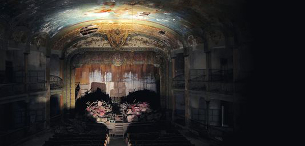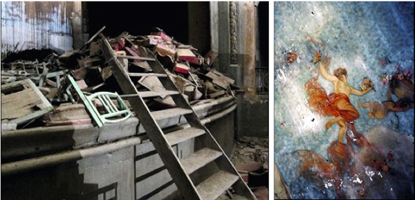 Dans le hall, malgré la poussière, on remarque de belles céramiques représentant Don Quichotte et Sancho Pança. Après un long couloir, on pénètre dans le théâtre. A nos pieds, les rangées de sièges en bois bien alignés et recouverts de toiles d’araignée, puis les baignoires, les loges avec des chaises renversées et, un peu plus haut, le poulailler. C’est un émerveillement. On a l’impression d’être dans un sarcophage. En levant la tête, on distingue la coupole du théâtre et ses fresques aux couleurs passées comme celles ornant l’intérieur de la salle. Sur ce qui reste de la scène, on aperçoit des peintures. Là où le parquet a été arraché, des poutres servent de passerelles. Un bout d’affiche est encore accroché sur un mur. Une tenture rouge mangée par les mites descend du plafond.