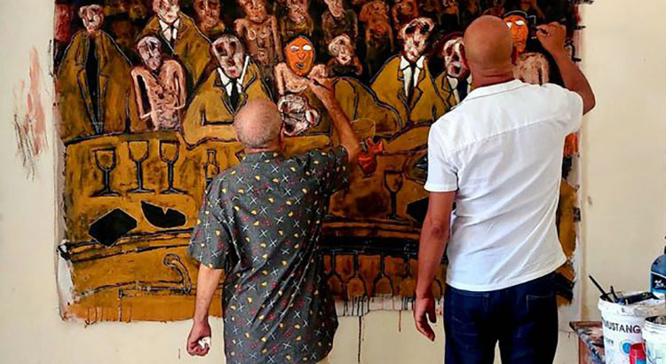 Les corps à l’épreuve de la vie, peints par les deux compères, sont marqués par ce combat de toujours. Gueules cassées de la guerre sans fin du désordre poétique contre l’ordre en place, ces personnages n’en sourient pas moins au monde : qu’il est bon d’avoir été brisé pour une bonne cause. Fiers et sûrs de leur bon droit, à la fête, ils avalent une bouchée de ma’joun, délice chocolaté et herbacé aux vertus d’enivrement, avant de lever leurs verres aux futurs affrontements et aux promesses de querelle, puis d’éclater d’un rire franc et irrépressible à en effrayer tous les bien-pensants: les personnages disloqués de Mohamed Benyaïch et de Mehdi Abdellatif le savent : ils sont du bon côté du monde, du bon côté de l’histoire, du bon côté de la vie. Leur marginalité est une centralité. Leur griserie est aussi confondante que le trouble qu’éprouve un oracle à recevoir la parole : ils connaissent les vertiges de ceux qui ont accès à la vérité. Ils souffrent, ces hommes et ces femmes peints par nos deux compères, cela se voit ; ils souffrent du regard de leurs contemporains ; ils souffrent de devoir endurer leur propre clairvoyance ; mais ils jouissent, car ils n’ont pas peur de leur plaisir et moins encore du regard du ciel, qui toujours restera du côté des justes et des innocents. Curator/ Ilias Selfati