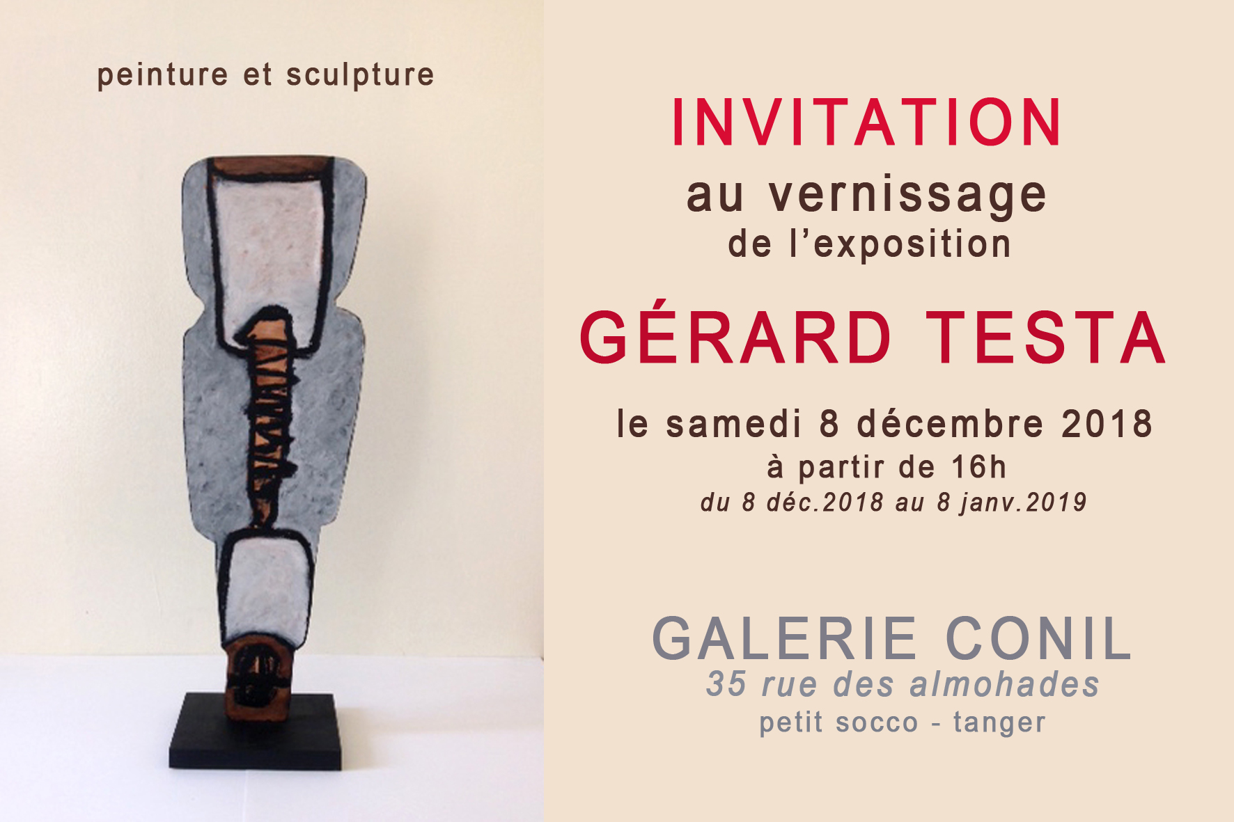 La Galerie Conil de Tanger présente les oeuvres de Gérard Testa. Une trentaine de sculptures, peintures et dessins, du 8 décembre 2018 au 8 janvier 2019.