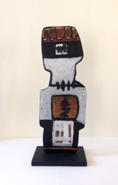 Si l’homme dans son tracé totémique est au coeur de mon oeuvre, la lumière et la matière jouent beaucoup dans mes représentations… Pour les peintures j’aime utiliser un support brut: le sotex (feuille d’isolation que l’on trouve dans la toiture des maisons américaines) que je révèle au trichloréthylène pour le détourner de son usage et lui donner de la profondeur. Je calcine la matière sur les côtés pour ne pas passer directement du noir au clair… Pour les sculptures, j’utilise du bois découpé, tout simple. Pour les dessins, le tracé est à l’huile sur des cartons bruts, d’emballage. Je n’utilise pas les produits classiques des beaux-arts. Je travaille comme ça depuis plus de 20 ans, j’aime beaucoup ces matières. »