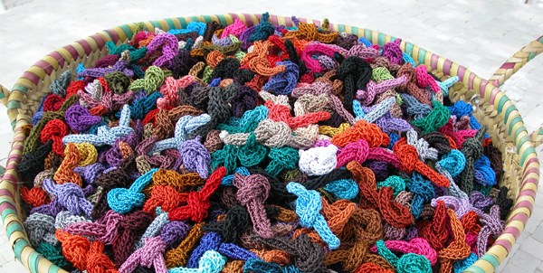Pour la composer : de petits nœuds de fils, 2500 petits nœuds, formés selon la technique « du tricotin », par des mamans célibataires, bénéficiaires de l’association tangéroise 100% Mamans.