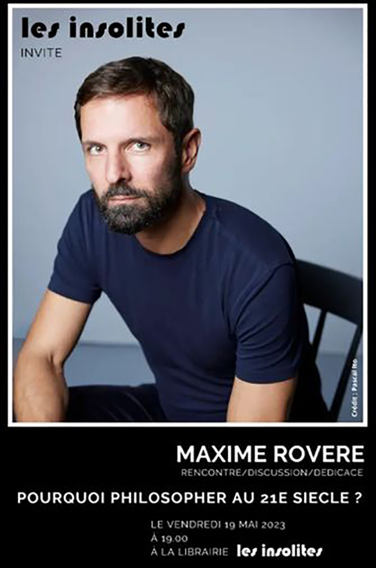 Sur le thème : « Pourquoi philosopher au 21e siècle », la librairie les insolites reçoit le philosophe et écrivain Maxime Rovere pour une rencontre, discussion et dédicace le vendredi 19 mai à 19h. Allez-y nombreux, vous n’allez pas le regretter.