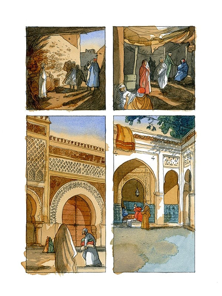 Quel dommage que Lofti Akalay, journaliste et écrivain tangérois, comme Battûta, dont Alessandra s’est inspiré pour son travail, n’ait pas eu le bonheur de découvrir cet album achevé et publié, un livre dépaysant s’il en est, sans frontières qui de Tanger à Fez, en passant par Alger, Le Caire, Ispahan, Delhi, Singapour ou Pékin, nous promène ; mieux, nous emmène.