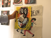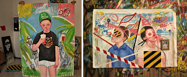 Il commence souvent à peindre une toile avec un première idée figurative, un jeune garçon pré adolescent en général, posé là sur la toile comme une lampe éteinte puis, peu à peu, il lui tourne autour, ajoute ses codes, crée des rythmes comme ses musiques entre acoustique et électro qui lui son chères et son humour se déchaine à grands gribouillages. Anuar attaque sa toile ! Il joue avec les manipulations, il s’illusionne, sort sa panoplie de petits lapins, chats, oiseaux, gants de boxe de Mickey etc. Construction et déconstruction.