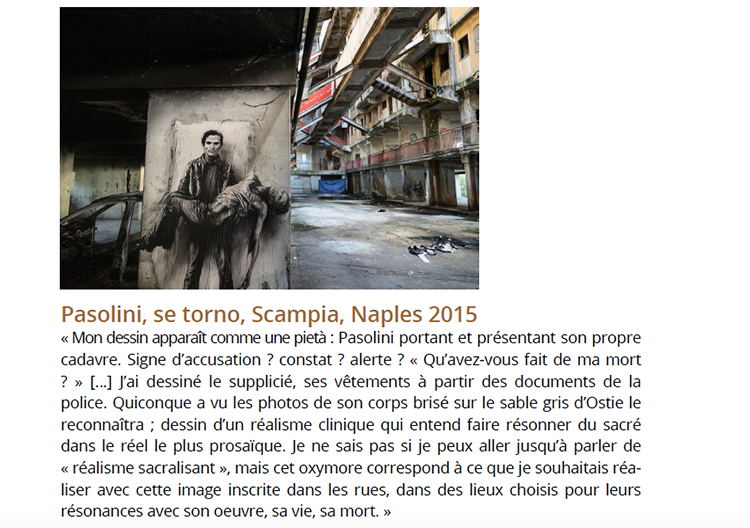 Du Chili à Soweto, d’Alger à Naples, de la Palestine de Mahmoud Darwich à la plage d’Ostie où Pasolini fut assassiné, de l’avortement à l’exclusion, du sida à l’immigration, chez Ernest Pignon-Ernest la confrontation des drames de notre temps comme l’exploration des destins individuels en rupture de norme ou des mythes à raviver, impose de prendre à chaque fois un risque inédit, celui-là même qui hantait Rimbaud quand il s’acharnait à trouver le lieu et la formule. Désormais, c’est plus de 60 années de création qui s’explorent et s’imposent à travers plusieurs dizaines de livres et des milliers d’illustrations qui se changent, aussitôt, en autant de témoins irremplaçables d’une entreprise qui n’a cessé de conjuguer l’éphémère à l’exact présent de la mémoire et des lieux. « Je ne fais pas des oeuvres en situation, j’essaie de faire oeuvre des situations » E.P.-E.