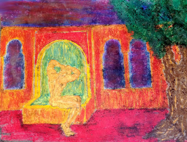 Son œuvre originale et forte, est caractérisée par des peintures qui proposent des espaces colorés. Travail sensuel des matières, maitrise des couleurs et des lignes pour ces corps sans regard qui s’abandonnent au notre. Corps qui semblent fait de matière brute, de cette terre marocaine, terre de renaissance pour l’artiste.