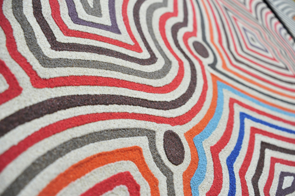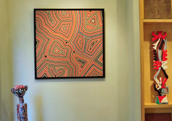 Et dans les deux cas, le tableau est une empreinte, celle d’un rêve ancestral chez Maimoun dans lequel la nature et les hommes sont reliés, celle du geste primitif chez Aroundou où la recherche de la beauté formelle et minutieuse de l’homme rejoint les créations de la nature, et en particulier celles du vent lorsqu’il dessine des cannelures et des spirales sur le sable du désert.
