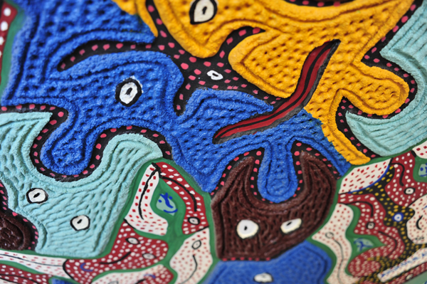 Deux peintres, Maimoun et Aroundou ; deux techniques du relief, l’un la poudre d’arganier, l’autre le sable ; deux vibrations, l’une massive et protectrice, l’autre ondulatoire et hypnotique.