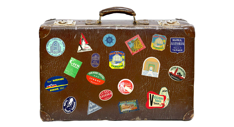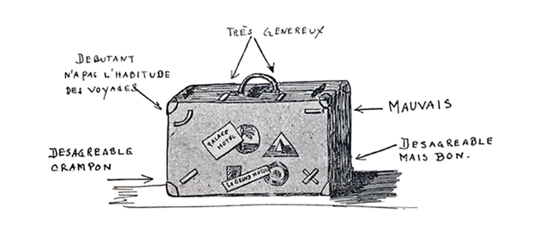 Que trouve-t-on sur les vieux bagages? « On y retrouve l’empreinte des moyens de transport employés, des voyages réalisés, des séjours effectués, tout cela marqué en vieux papiers, en étiquettes : Ce sont d’abord des étiquettes de compagnie de chemin de fer portant le nom des points de départ et de destination, et le numéro d’enregistrement qui permettra, en principe, à l’arrivée de rentrer en possession des bagages confiés au transporteur.