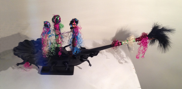 Elle réalise également des sculptures faites d’objets glanés dans la médina et à Casa Barata, le marché aux puces de Tanger. Elle assemble ces éléments comme un acte de métissage physique, culturel et artisanal. Une arche, peut être celle d’un Noé plus contemporain ou celle de ces immigrés qui fuient vers les mirages de l’Europe et trop souvent vers des destins noirs…