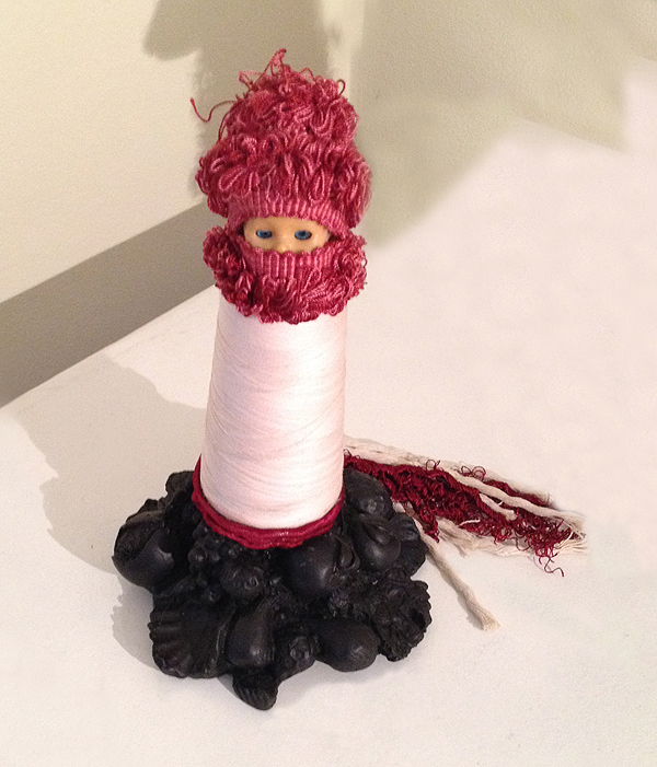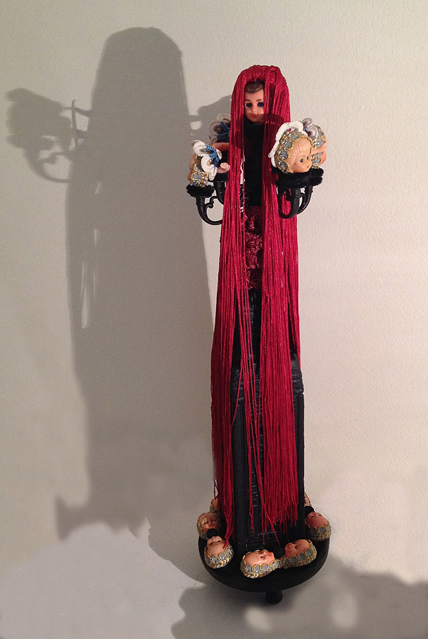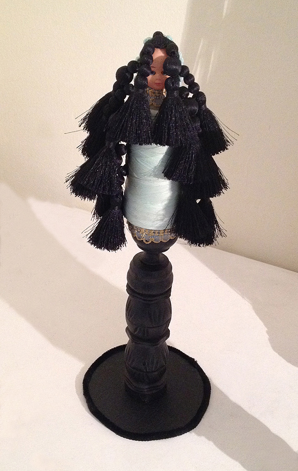 Des statuettes qui dissimulent leur existence derrière des tchadors imaginaires en fils de soie. Socles en bois venus de nulle part et chinés au hasard de ses errances Tangéroises, bobines de fil, têtes de poupée venues de France, foulards de passementerie du Maroc.