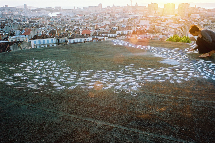 Elle poursuit également le développement d’un projet d’envergure, qu’elle initie en Inde, avant de le décliner dans plusieurs villes méditerranéennes. Alice Hamon dessine sur les toits terrasses, en utilisant un matériau volatile comme la craie. Ces réalisations très graphiques, inspirées par la cartographie ou des motifs géométriques (yeux, amulettes, rose des vents, tapis…) sont ensuite photographiées dans leur contexte. Les traces sur le toit, au premier plan de l’image, se rapprochent d’une configuration symbolique ou imaginaire d’un lieu qui entre en résonance avec l’espace réel photographié. Elle sollicite ainsi une dynamique visuelle, nous éloignant doucement de la réalité pour laisser place au rêve et à l’imagination. De ce travail, Jean-Luc Chalumeau a pu écrire : « Pour les photographes, il n’y a pas de supériorité esthétique entre l’effort d’embellir le monde et l’effort inverse de lui arracher son masque. C’est à cette double tâche que se consacre Alice Hamon avec virtuosité ».