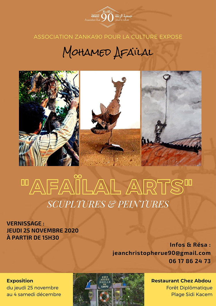 L’association « Zanka 90″ pour la culture est fière et heureuse de permettre à Mohamed Afaïlal, artiste plasticien de 54 ans, d’exposer enfin à Tanger ! Diplômé de l’Institut National des Beaux Arts de Tétouan (INBA) dans les années 80 et travailleur acharné pour son art, il n’avait jamais eu l’opportunité de présenter son travail très singulier dans la Capitale du Détroit. Zanka, Zanka !