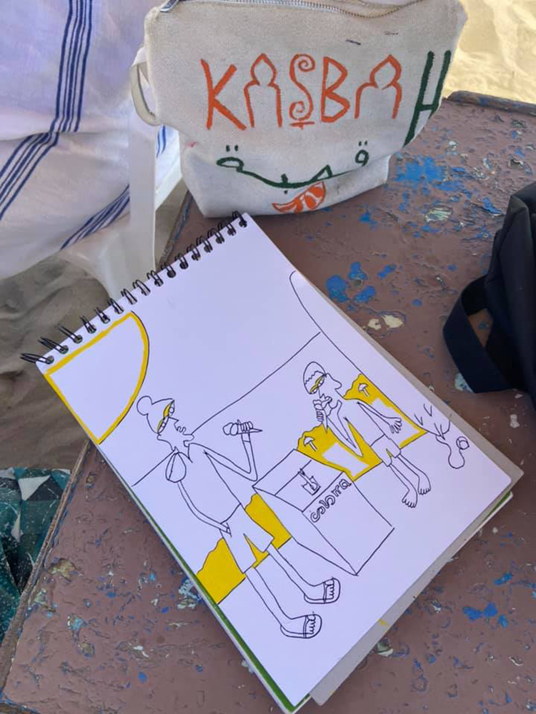 « En ce fameux mois de mars 2020, alors que la préoccupation principale était de faire des réserves de riz et lentilles, Noam achetait peinture, feutres, toiles et ramassait tout autour de lui tous les supports possibles: bout de bois, carton, plastique. Et chaque jour de ses 3 mois d’enfermement fut pour lui l’occasion de laisser libre cours à son imagination et sa création. Au milieu de ses dessins composés de traits, de ronds sont apparues d’étranges formes qui se sont métamorphosées en personnages hauts en couleur criant leur amour de la vie, de la liberté, du voyage, de la vie et de la ville de Tanger. »