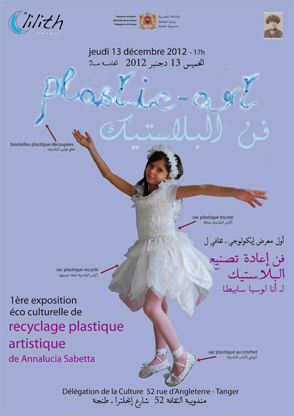 PRATIQUE: L’atelier artistique de recyclage sera ouvert au public du mardi 4 au samedi 8 décembre 2012 de 16h à 19h. Le dimanche 9 et le lundi 10 décembre, horaires à préciser, auront lieu des ateliers de perfectionnement des objets qui seront intégrés à l’exposition de recyclage artistique « Plastic-Art » (Plasticodipendenza) de Annalucia Sabetta qui se tiendra le jeudi 13 décembre à la Délégation de la Culture de Tanger. Destiné aux passionnés d’art mais aussi d’écologie et développement durable… Et en plus c’est gratuit!