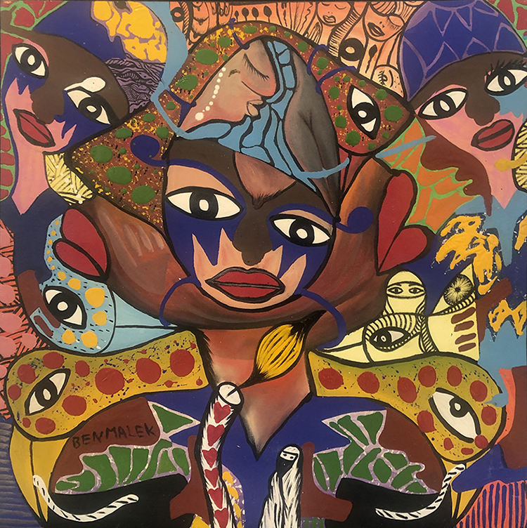 Imaginaire débridé, éclat jubilatoire des couleurs. Les créations spontanées de Mostapha BEN MALEK ont la fraîcheur de la vie et de la musique. Son œuvre explore les intérieurs, interrogent le secret et le subconscient par le truchement du regard. Peinture ethnique, puissance créatrice du geste, son travail se caractérise par la nature, les personnages et les animaux emportés dans une agitation délirante.