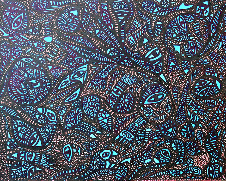 Dans des entrelacs complexes, on reconnaît des figures tribales ou des sortes de monstres aquatiques dans le genre scolopendres ou serpents à plumes qui font écho autant à ses origines de la tribu montagnarde des Beni Ouriaghel qu’à sa proximité actuelle avec la mer, devenue l’élément clé de son œuvre.