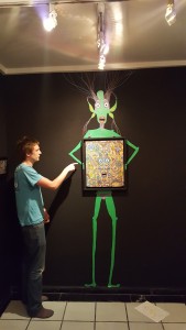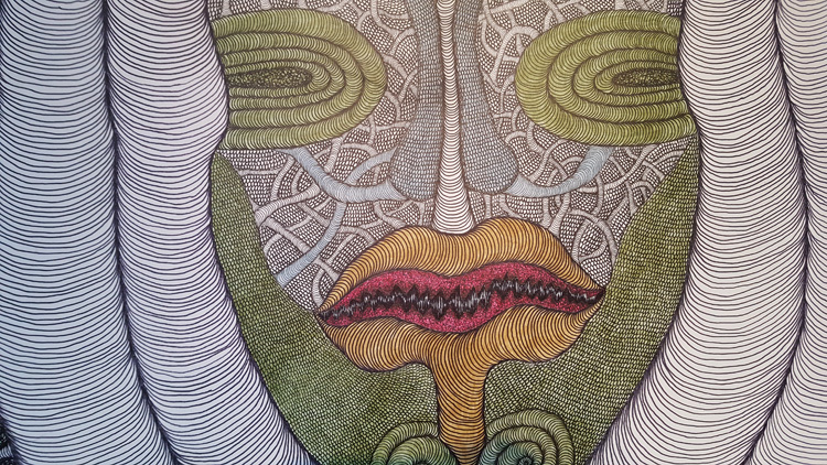 Léonard Combier dont les dessins renvoient à des scènes de science-fiction à multiples entrées, parle de ses dessins comme une sorte « d’écriture complètement automatique, plus de 12 heures par jour, je voudrais aller vers toujours plus de détails, dans un maximum de petites histoires à tiroirs, drôles si possibles». « C’est vrai, je dessine beaucoup de bites. Mais c’est drôle une bite, non ? » En tous cas, il les dessine bien. Et c’est vrai, elles sont plutôt marrantes, ses bites, à rechercher tout de même à la loupe.