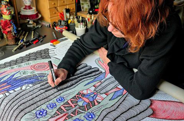Dans chaque toile ou dessin, je m’amuse et me moque avec tendresse de notre monde. J’ai été adoptée, il y a quelques années, après mon exposition chez Cerès Franco à Paris, par la famille de l’art singulier, art visionnaire, coloré et hors les normes