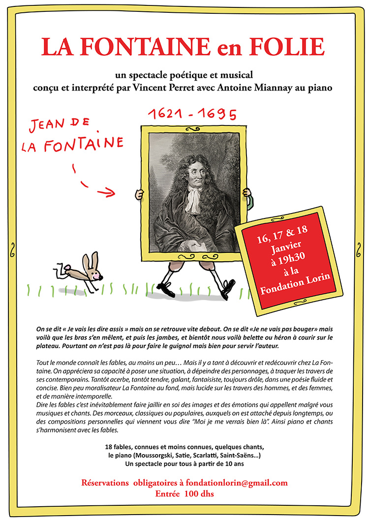 La Fondation Lorin propose un nouveau spectacle poétique et musical: « La Fontaine en folie » conçu et interprété par Vincent Perret avec Antoine Miannay au piano les 16, 17 & 18 janvier à 19h 30.