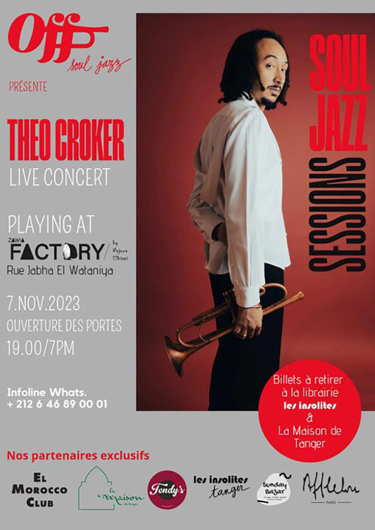 Les « Soul Jazz Sessions » lancées en 2018 par Sound Stories de Cédric Abouchahla sont de retour à Tanger pour le plus grand plaisir des véritables aficionados de la bonne musique. Theo Croker un des plus grands trompettistes américains du moment se produira à Zawia Factory by Najoua le mardi 7 novembre 2023 à 20h15 (ouverture des portes à 19h).