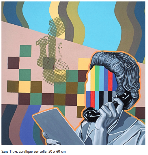 Avec ses visages fragmentés et masqués de bandes colorées, Hicham Matini offre une réflexion critique sur notre société numérique et la déshumanisation provoquée par les écrans et la technologie.