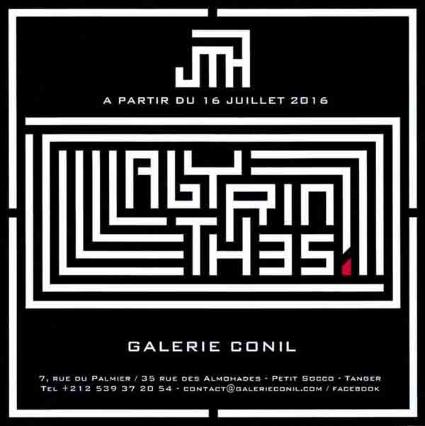 Exposition LABYRINTHES de JMH à la Galerie Conil du 16 juillet au 16 août 2016. JMH ou l’obsession du labyrinthe comme espace d’interrogation. Exclusivement en noir et blanc avec ici et là une pointe de rouge, comme une virgule pour garder le spectateur éveillé…