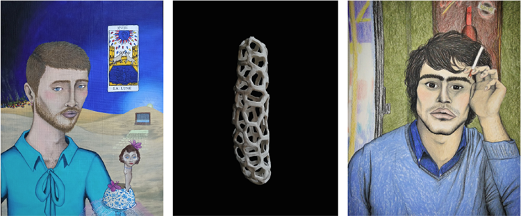 Céramiques organiques, peintures figuratives sur cartons d’emballage recyclés, autoportraits, figures grimaçantes, scènes de vie quotidiennes ou portraits psychédéliques, les oeuvres de Thomas Mendonça vacillent entre les mélodrames sentimentaux, la culture post-pop et la beauté de la singularité.