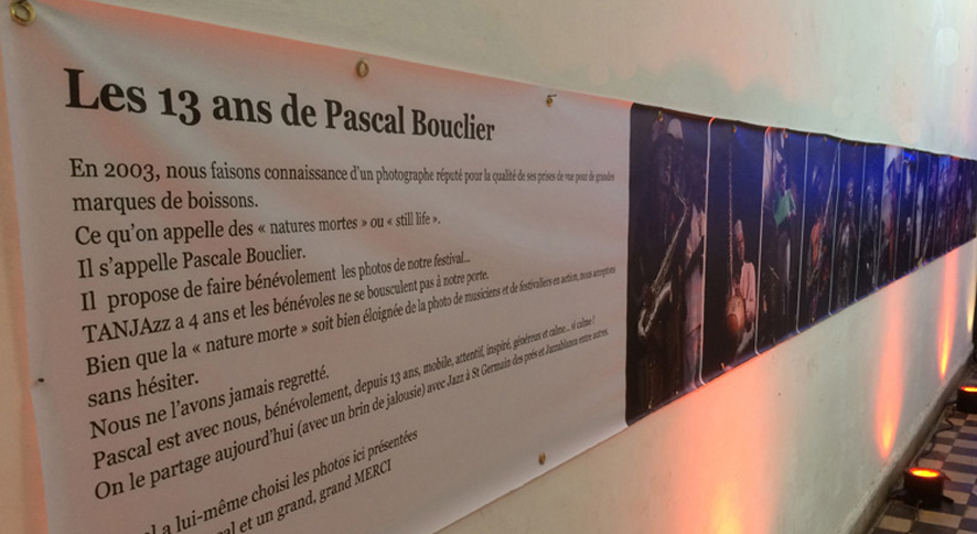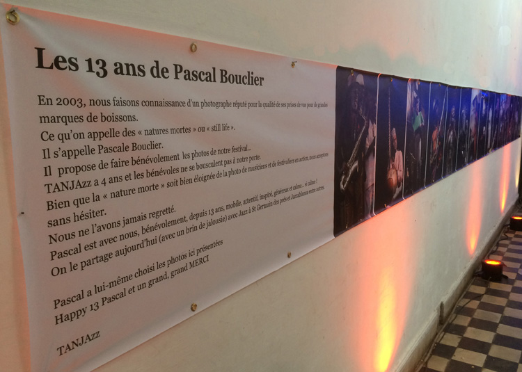 Depuis 13 ans, Pascal Bouclier, photographe parisien spécialisé dans les prises de vue « still life », food et marques prestigieuses de boissons, assure bénévolement la couverture photographique de Tanjazz. Cette année Tanjazz lui a rendu hommage avec une expo d’une sélection de ces clichés dans l’enceinte de Tanjazz.