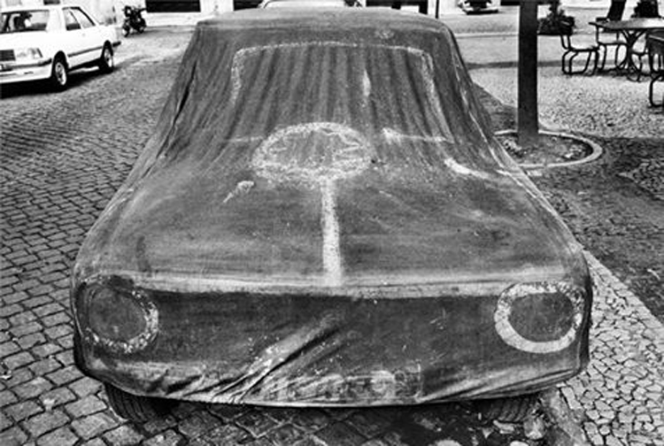 « …Voiler, bâcher, c’est abriter, protéger, c’est aussi cacher et rester maître de l’objet tout en laissant apparaître quelques indices. A Lisbonne quelqu’un a dessiné sur la bâche un volant et le contour d’un pare-brise… »