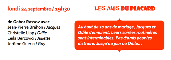 « Avant, ma femme et moi, nous nous emmerdions. » Voilà ce qu’explique aussi posément que crûment Jacques au lever de rideau, s’adressant aux spectateurs. Marié à Odile depuis de longues années, son couple était au bord du gouffre. Des parents commodément évacués en maison de retraite, des enfants ingrats parce que livrés à eux-mêmes, Jacques et Odile se retrouvaient sans personne autour d’eux, et surtout sans amis. Car, s’il est agréable d’avoir des gens qui s’intéressent à nous, l’embêtant avec les amis, c’est qu’il faut aussi être présent pour eux. Impensable pour Odile et plus encore pour Jacques. « Ma femme est très conne » précise-t-il, ceci expliquant sans doute cela. Par bonheur, la crise économique est venue au secours de nos deux esseulés : il est désormais possible d’acheter des amis comme on achète sa lessive, au supermarché. Des « amis » – chômeurs en fin de droit, désireux d’éviter la rue – bien évidemment échangeables et vendus sous garantie ! Une aubaine pour notre couple, qui n’en pouvait plus de se regarder en chiens de faïence. D’autant plus que ces « amis » ne sont guères onéreux : ils se nourrissent de restes et sont logés à demeure… dans le placard du salon, ce qui est bien pratique pour les sortir et les ranger à loisir…