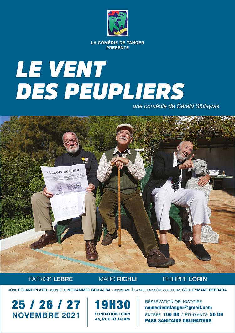 La Comédie de Tanger propose une nouvelle pièce « Le vent des peupliers » une comédie du dramaturge français Gérald Sibleyras interprétée par Patrick Lebre, Marc Richli et Philippe Lorin les 25, 26 et 27 novembre 2021 à 19h30 à la Fondation Lorin. Il est prudent de réserver…