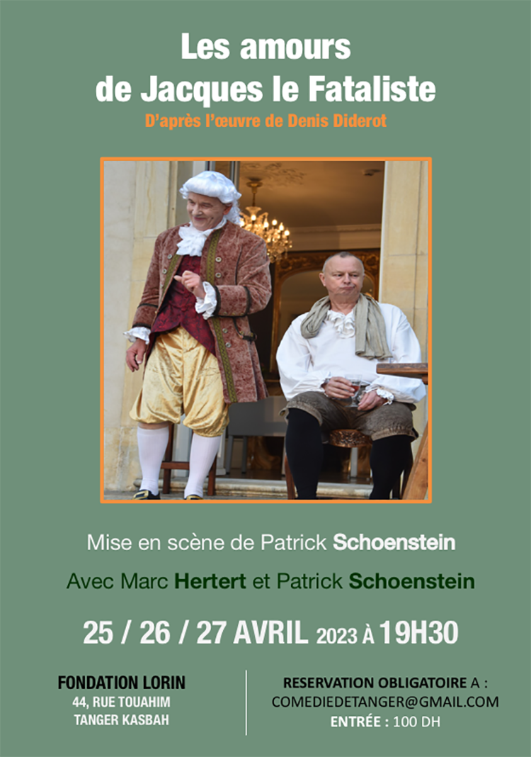 La Fondation Lorin propose un nouveau spectacle théâtral : « Les amours de Jacques Le Fataliste » d’après l’oeuvre de Denis Diderot avec Marc Hertet et Patrick Schoenstein les 25, 26, 27 avril à 19h30.