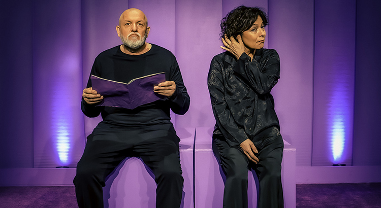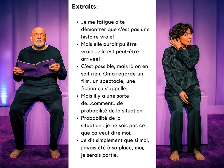 Ma mise en scène fait le choix de nous entraîner dans un huis clos dicté par les circonstances du texte. La demeure devient un cocon qui va se déchirer ou se reconstruire tandis que le couple va imperceptiblement instiller par ses actes, des dérapages qui enveniment les tensions, exacerbent les inquiétudes. Le parti-pris de l’épure, tant dans le choix des éléments du décor que dans celui esthétique de l’unité de couleur (omniprésence du mauve : couleur de l’imagination et de la mélancolie) permet de laisser une place de premier plan aux personnages et au texte qui colore le tout d’humour aux différentes teintes, et se paie parfois le luxe d’installer de vrais moments d’émotion.