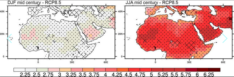 Au Moyen-Orient et en Afrique du Nord, la température moyenne en hiver augmentera d’environ 2,5 degrés Celsius (à gauche) vers le milieu du siècle, et en été d’environ cinq degrés Celsius (à droite) si les émissions mondiales de gaz à effet de serre continuent d’augmenter selon le scénario business-as-usual (RCP8,5). © MPI