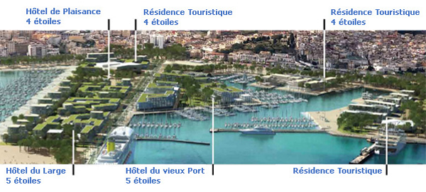 42 000 m de commerces, dont un grand centre commercial de 15 000 m verront également le jour, parallèlement à la construction de logements et de bureaux sur 130 000 m. Un téléphérique reliera le port au centre-ville et à la kasbah.
