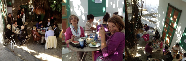 Le café/terrasse sous le ficus centenaire ouvert de 09 heures à 17 heures non stop. En ce moment le menu du midi n’est pas servi à l’extérieur (sous le ficus), il est proposé uniquement au restaurant, et change chaque mardi. (Entrée/plat/dessert ou café – 170 Dh)