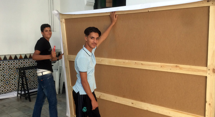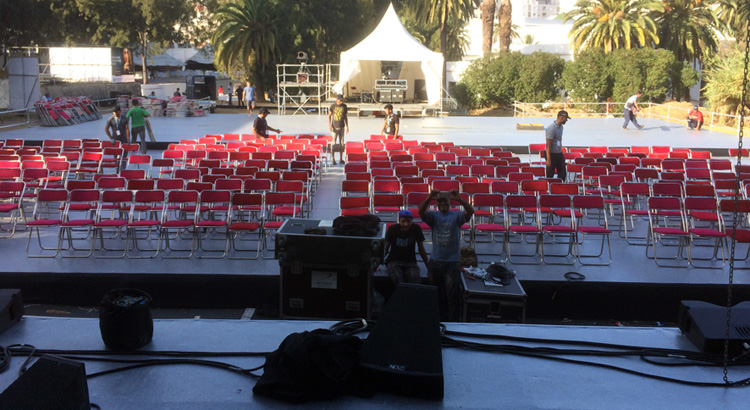 La sécurité veille sur le Palais durant les préparatifsSilvia Coarelli assure la coordination du festivalMary-Rahma briefe et coordonne les équipes de stagiaires qui travaillent sur le festivalNacer Amiar, directeur du Festival veille au grain…Fatima, Georgette, Hanane les femmes de confianceOn cloue, on visse, on agrafe…Mohamed, l’homme orchestre du festival TanjazzScène de la cour d’honneur, dans la solitude de la préparationOn transporte les fontaines à boissonSous les tentes du nouveau resto des artistesLe catering en action…La grand scène BMCI en montageComme si vous étiez une star du festival…Les Tiguan de VW, partenaire du Festival, attendent de transporter les artistes et les VIPAbdou et Eugenia du restaurant Tabadoul se préparent pour vous régaler…On vous attend jeudi soir pour le premier concert
