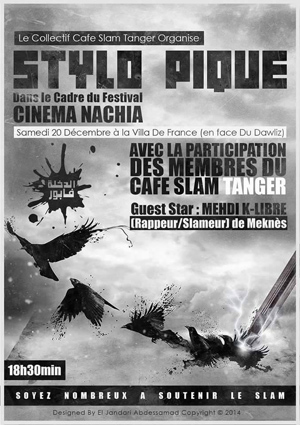 Le Collectif Café Slam Tanger en collaboration Avec le Festival Cinéma Nachia Organise une Soirée Slam sous le Thème : « STYLO PIQUE » avec la participation des membres du Collectif et du rappeur-slameur: Mehdi K-Libre. Une soirée de « grand calibre » vous attend…