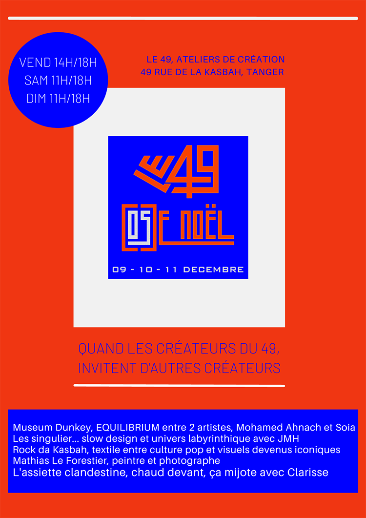 Le 49, rue de la Kasbah à Tanger, une excellente adresse pour faire des cadeaux de Noël créatifs. Alors réservez un moment pour rendre visite aux créateurs des ateliers de création du 49 les vendredi 9, samedi 10 et dimanche 11 décembre prochains.