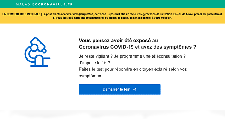 « L’Alliance Digitale », plateforme créée par des spécialistes de l’Institut Pasteur, des CHU de Lille, Rennes et Angers propose des informations utiles pour se protéger de la contamination ainsi qu’un test numérique en 24 questions pour évaluer une potentielle contamination au Covid-19.
