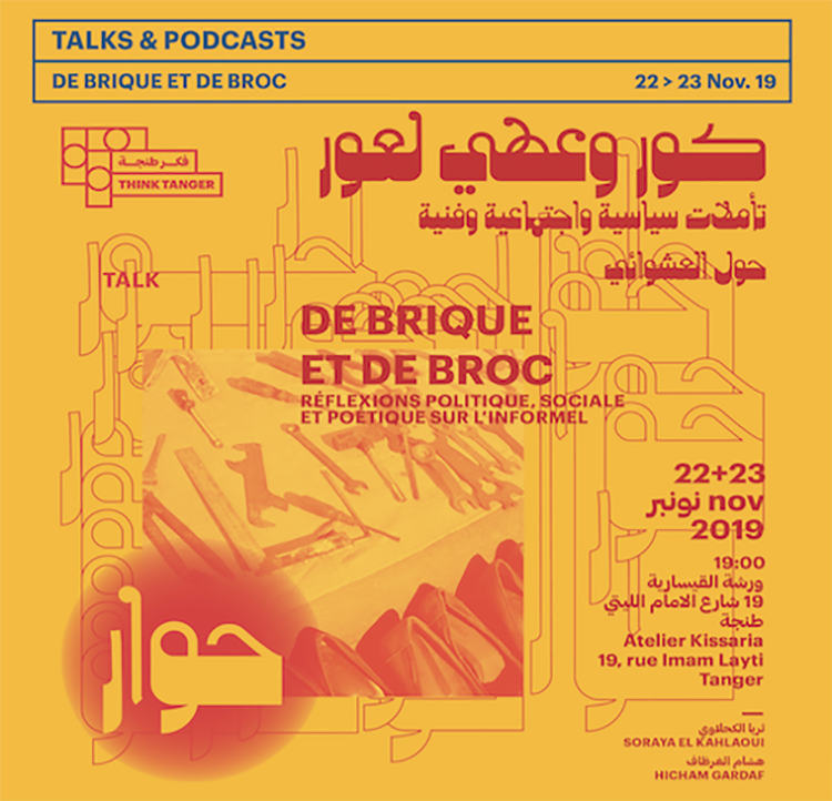 Think Tanger organise « De brique et de broc » vendredi 22 et samedi 23 novembre à l’Atelier Kissaria. Pendant ces deux jours, il s’agit de partager des réflexions politique, sociale et poétique sur la notion d’informel dans la ville à travers l’oeil du photographe Hicham Gardaf et au biais des réflexions de la sociologue et réalisatrice Soraya El Kahlaoui.
