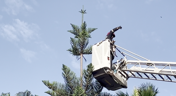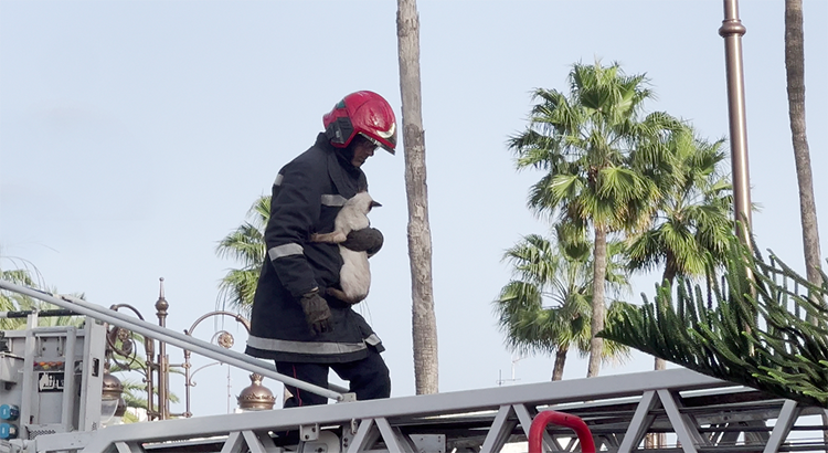 Le 28 novembre dernier nous avons vécu une belle intervention de solidarité place du Grand Socco avec le sauvetage spectaculaire d’un chat siamois réfugié au sommet d’un palmier tropical par les pompiers de Tanger avec leur grande échelle.
