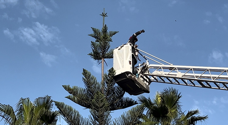 Installé dans sa nacelle au bout de la grande échelle un pompier de Tanger a été hissé au sommet de l’arbre et a sauvé le minou sous les hourras et applaudissements des badauds et les larmes de sa maîtresse.