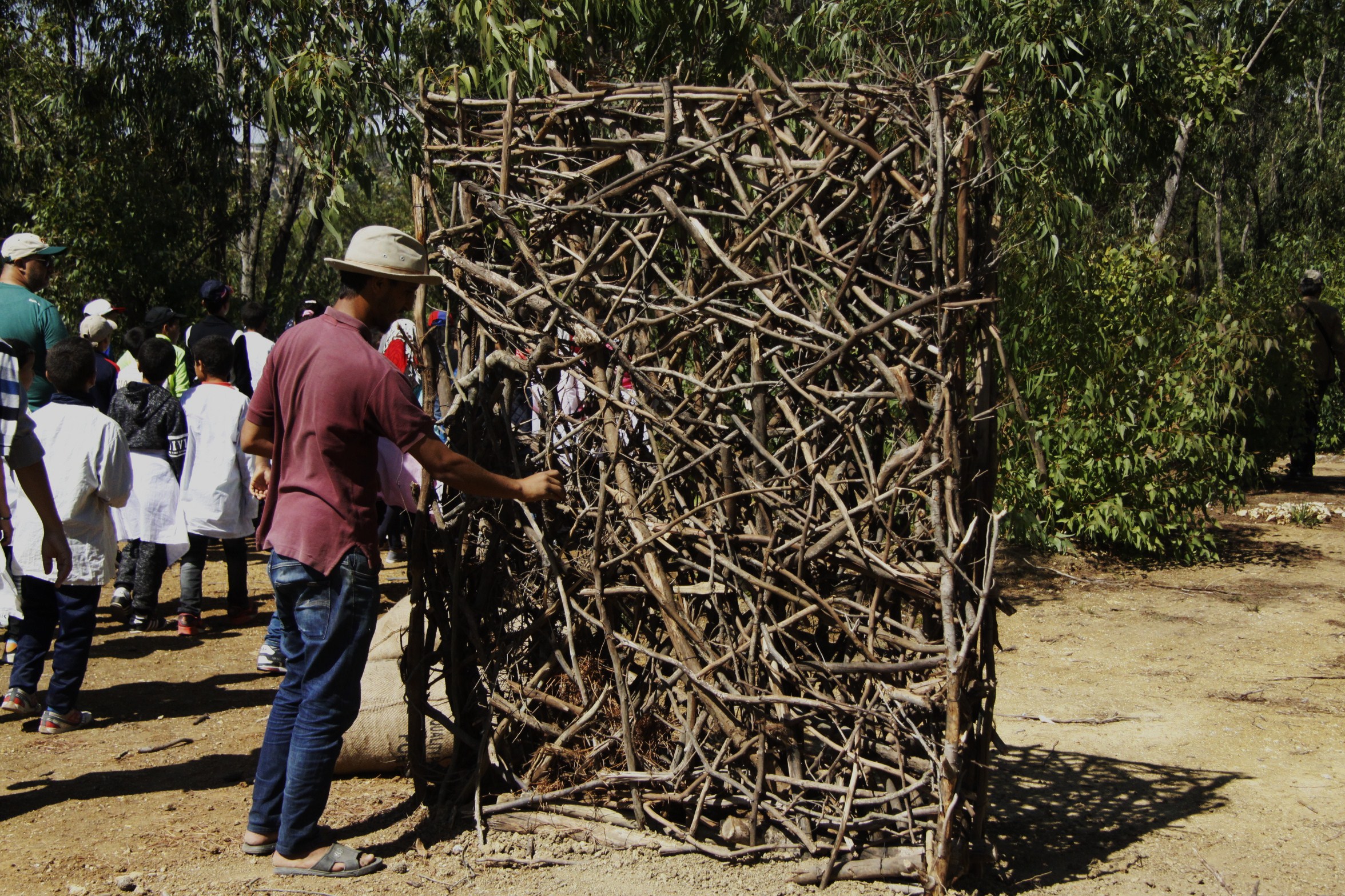 Il utilise le cadre et les matériaux de la nature (bois, terre, pierres, sable, eau, rocher etc.) pour réaliser des sculptures originales et surprenantes. Les œuvres réalisées sont en extérieur, exposées aux éléments et soumises à l’érosion naturelle. Il s’agit de créer des nouveaux espaces de création et d’expression pour les artistes marocains.