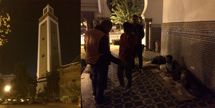 A proximité s’élève une mosquée. Là encore même scénario avec un groupe important de personnes allongées sous le porche, dans des recoins, des coursives extérieures, derrière le bâtiment. Ils dorment. Mais quand ils entendent la voix d’Abdellah les têtes et les corps émergent des couvertures et des cartons pour profiter de la nourriture qui leur tombe du ciel…